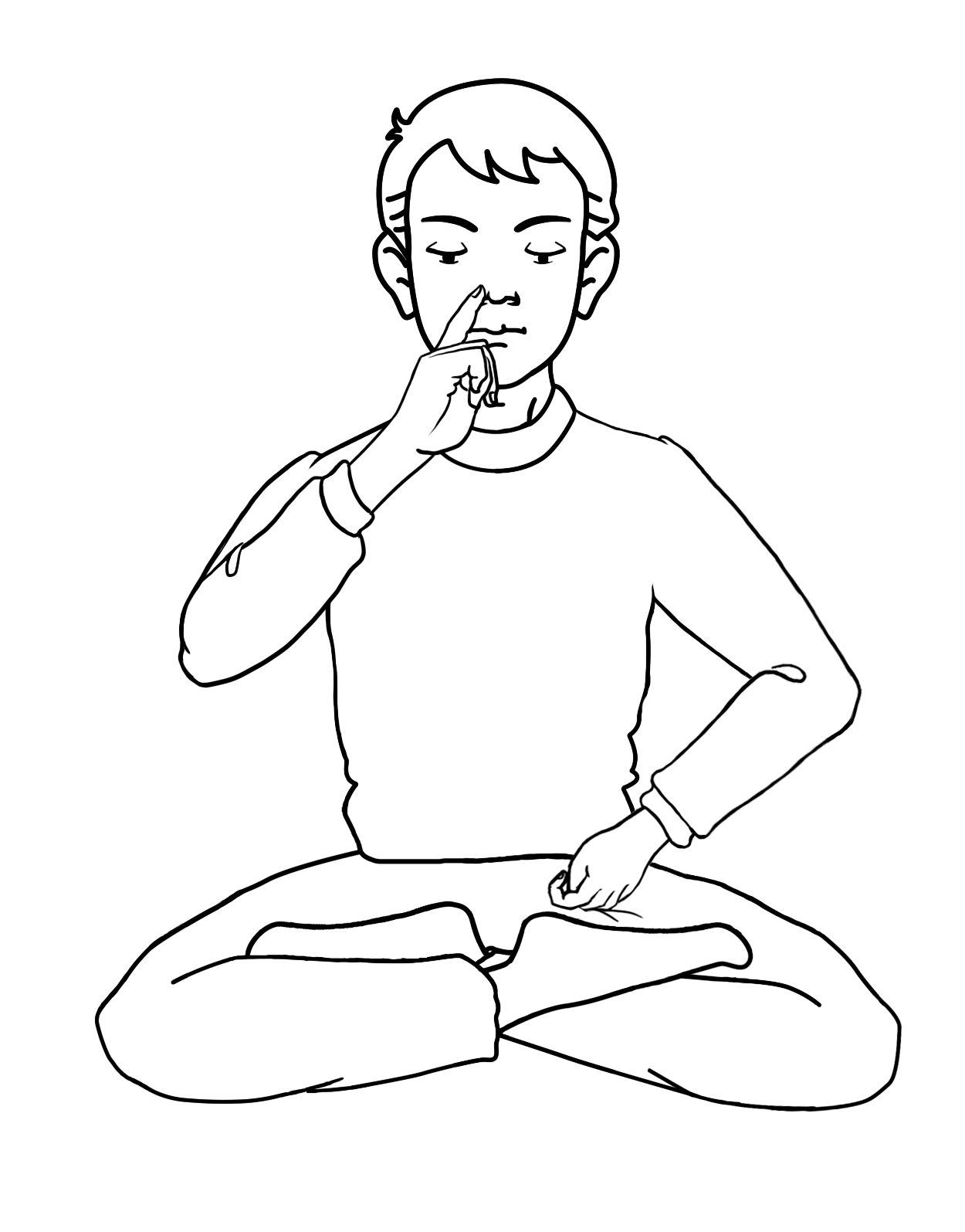 交换左右手的握法,右手握金刚拳压住右大腿腿根的血脉,左手也跟前面的右手一样,用食指压住左鼻孔,从右鼻孔深长地排气。同时观想所有的不良情绪及疾病等,全部转换为肮脏的黑色气体,悉数从右鼻孔排出。这个动作也是做三次。