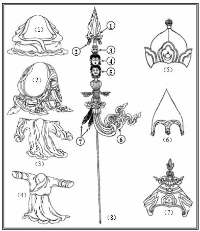 (8)天杖:①顶端三尖,②九铁环, ③ ④ ⑤ 干湿旧三头骨,⑥五种彩绸,⑦死人与活人的头发。